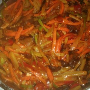 倒入菜丝,鱼香汁翻炒,放适量盐