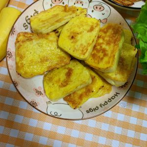 馒头切片,鸡蛋搅拌成蛋液加适量盐(三分之一勺,不要做的太咸,吃太咸,老得快)