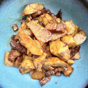 不停地翻炒,炒好后加入水、八角、桂皮、姜、老抽煮