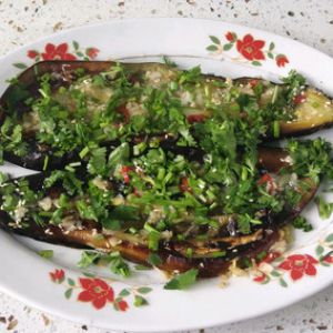 盛入盘中,将余下的料汁儿全抹在茄子上,撒上香菜和小葱即可食用。
