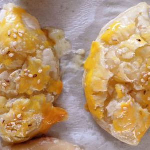 将蛋挞皮对折捏紧,一定要捏紧要不然芝士会跑出来的,在这个过程中可以把烤箱180度预热