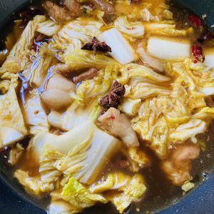 白菜切段,粉条浸泡在水中至变软,五花肉切片用生抽腌制十分钟,干辣椒切段,准备好蒜末姜末葱段