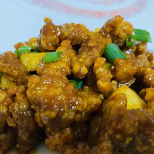 锅内留底油,关小火,分别加入白糖,老醋,生抽,番茄酱,再加入3小勺子水,将汤汁调制浓稠,最后放入炸好的肉翻炒均匀就可出锅。(孩子爱吃土豆,我加入了炸好的土豆块)
