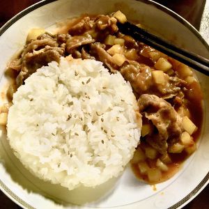 将米饭用小碗盛好,扣入盘内,将做好的西红柿土豆肥牛盖在饭上。