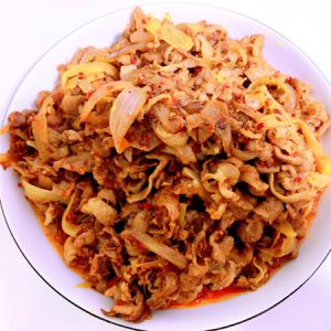锅里热油,洋葱切丝下入锅中翻炒,加一勺孜然,翻炒至洋葱变软,下入羊肉片