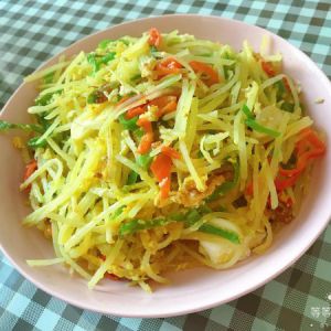 鸡蛋稍微煎一会,把土豆丝翻过来覆盖在鸡蛋上。加入盐、鸡精、翻炒均匀即可出锅。