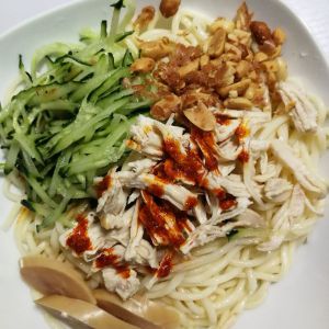 最后!盛一点面条,浇上两勺芝麻酱,再拿上黄瓜,小葱,鸡丝,花生米,浇上香香的红油,一碗炒清爽好吃的鸡丝凉面就完成了!