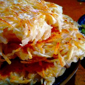 开电饼档,倒入油,用手,抓一把土豆丝面团,用手按压成一个饼,放进,电饼档,