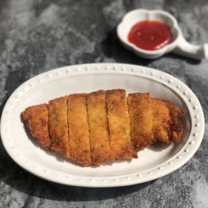 ③鸡蛋打散,准备一个盘子放面包糠,另一个盘子放玉米淀粉,腌制好的鸡排,按照玉米淀粉→鸡蛋液→面包糠的顺序,表面全部裹满面包糠。