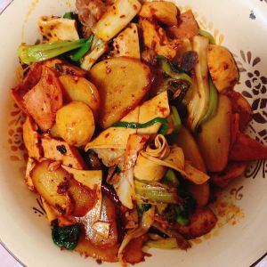 起锅烧油同时放入牛油火锅底料,(2人份麻辣香锅,可以放三分之一的150g规格的底料,大致是这样,依据个人口味适量加减)以及郫县豆瓣酱(无需太多),炒化。注意不要开到最大火,以免烧焦,想让口感丰富的,可以同时加入干树胶段,和麻椒粒,口味轻的可以不加。
