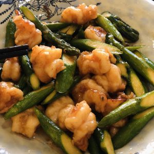 锅里放油,把腌好的虾仁放入煸炒熟,放入绰完水的芦笋,蒜末,小米椒一起翻炒,出锅前放入生抽,盐,花椒油调味即可!