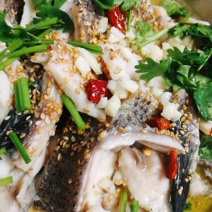 大火烫熟鱼片。一片一片下锅烫,不要把过多的的淀粉浆加入锅里。一分钟即可。烫熟后捞出放在鱼骨上