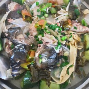 底锅放油把鱼头两面略煎下,放入蒜片、姜片和酸菜,倒入1000mⅠ清水,放鸡精,倒入适量料酒,盖锅盖煮到汤呈浅奶色,依次放入千层(百页)、青瓜段,再次煮沸,下入青椒,煮至浓奶白色,放十三香和胡椒粉,撒上葱花既成