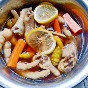 加三勺醋,三勺生抽,半勺冰糖,大概四分之一勺盐,然后加入凉白开没过鸡爪,拌均匀