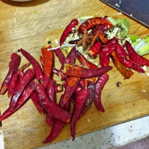 另外拿个锅、放油、下葱姜蒜、花椒、干辣椒、八角、香叶、豆瓣酱、火锅底料下去。小火炒香