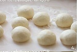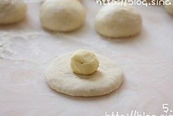 取一份面团,压成中间厚四周薄的圆片形,包入一份奶酥馅