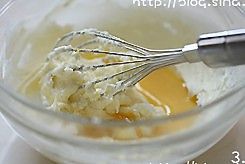 加入糖粉和盐用蛋抽搅拌均匀并打发至膨松