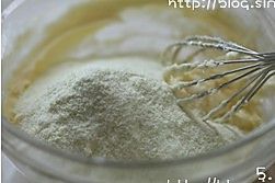 将蛋液搅拌至吸收后,加入奶粉拌匀