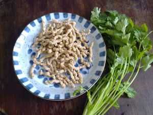 起锅热油,下素豆条大火翻炒,加盐,一汤勺料酒沿边烹入,翻炒均匀后加入芫荽,再炒两下子,出锅啦!