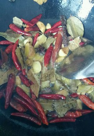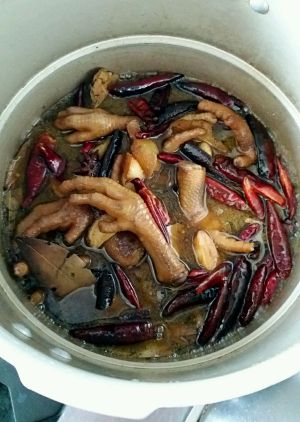 所有的配料下锅后倒入倒入鸡爪,翻炒均匀后加入适量水