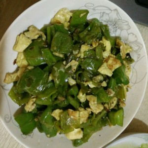 再重新在锅中倒入油,倒入打好的鸡蛋,煎好用锅铲切成小块。倒入青椒一起翻炒。加油盐等佐料。
