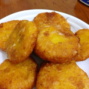 用手蘸点糯米粉,捏成饼状就可以下油锅啦