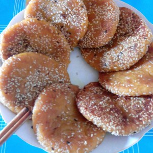 将小圆放入芝麻碗中晃几下,让它沾上芝麻,这样按压的时候就不会粘手了