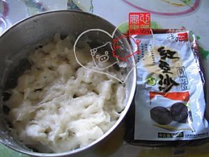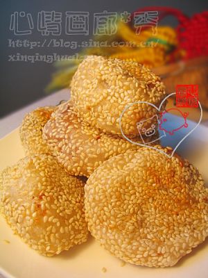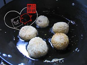 蒸熟的糯米粉待不烫手后,加少许猪油拌匀,揪一块包入一小团红豆沙,再搓圆了,滚上一层生芝麻,入油锅里小火炸得芝麻变黄。