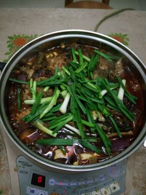 加入开水和蒜苗,闷锅煮15分钟就可以吃了。