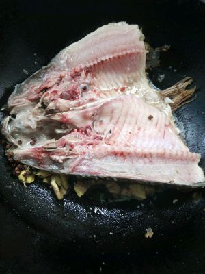 因为有咱们家的锅小所以鱼切了一半。放入油,用中火把鱼煎黄,放入姜,花椒等佐料。