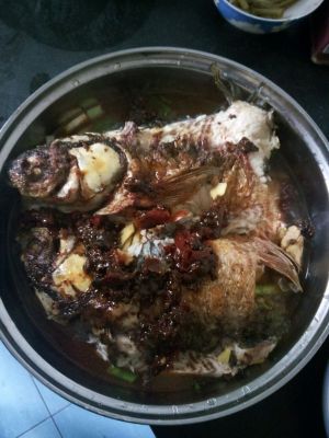 把煎好的鱼也放入火锅里。放上诸葛秘料和豆鼓,还有少许盐。