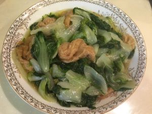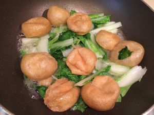 油热后放入杭白菜翻炒,菜叶翻炒变软后后加入油面筋,可用菜勺压一下油面筋,然后放少许白糖翻炒,加水烧开,起锅前放少许盐即可。