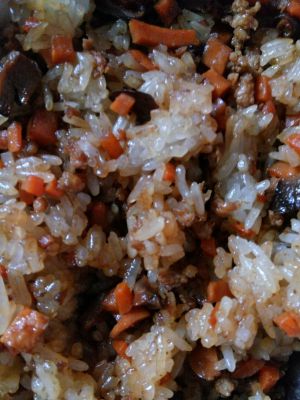蒸糯米饭的时候把肉剁碎用少量生抽和料酒腌上,把胡萝卜等食材切碎,锅中放油(油要多因为还要拌糯米饭)依次把肉 胡萝卜等食材放入锅中炒熟,炒熟的料放进蒸好的并用白糖拌好的糯米饭中一起拌匀最后加老抽着色