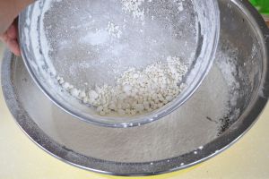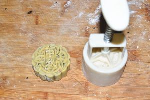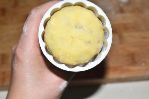 模子里倒入些面粉,转几圈再倒出来,放入馅轻轻按扁。