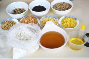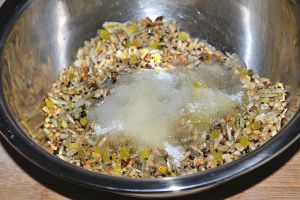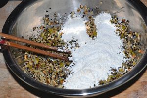 材料中大些的材料切碎,都倒入盆里,再倒入白糖70g,植物油30ml,白酒10g,水80g搅拌均匀。
