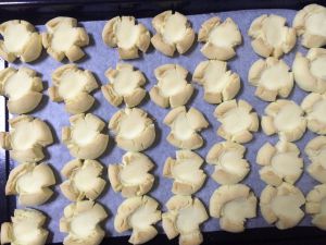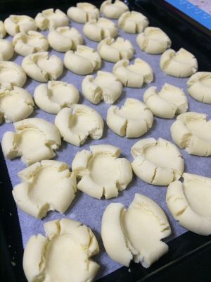 揉好的小圆球放在烤盘上,用大拇指按扁,按扁的时候,饼干会自然出现裂纹。