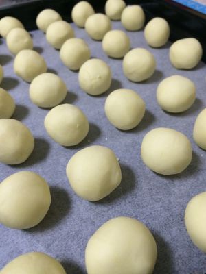 揉好的面团状态应该是略微偏干,不过分湿润,也不会因为干燥而散开。取一小块揉成小圆球。