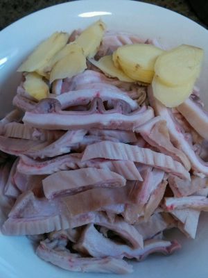 猪肚洗净后焯水,将里面多余的肥油全剥干净丢掉,切成丝,生姜切片