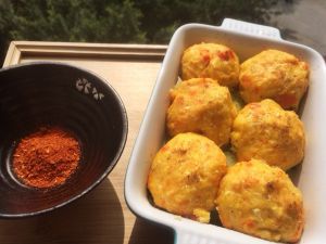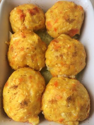 把土豆泥团成圆子的形状依次码入烤盘里(烤盘里铺上锡纸或者码入烤碗里烤碗刷一点油)
