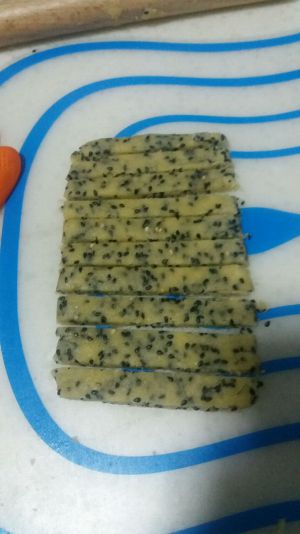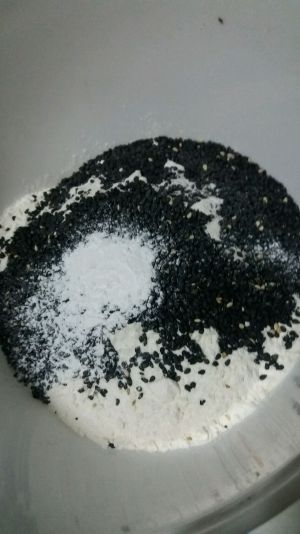 过筛的面粉加入芝麻,鸡蛋和泡打粉,搅拌均匀