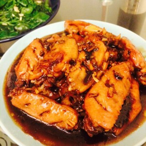 将翅中捞出洗净,将蒜姜切末。锅中放入色拉油(平底锅为好),将蒜姜爆香,改小火,依个放入鸡翅,待鸡翅煎2分钟后加入料酒,不用太多,此时不能盖上锅盖,否则鸡翅的腥味难除,调大火,加入一听左右的可乐,加入少许盐,盖上锅盖。