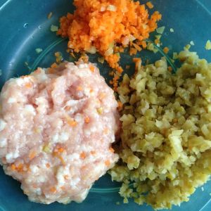 肉剁末,榨菜和2/3的胡萝卜切碎,三者混合,加花生油大半汤匙、盐1小勺、料酒1汤匙、蚝油1汤匙、鸡汁半汤匙、鸡蛋1只,搅拌上劲;