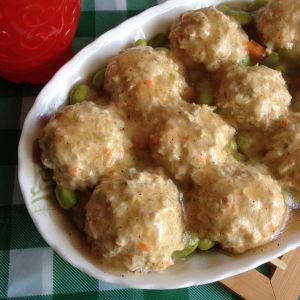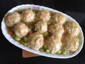 将榨菜肉末挤成肉圆摆放在毛豆肉上;