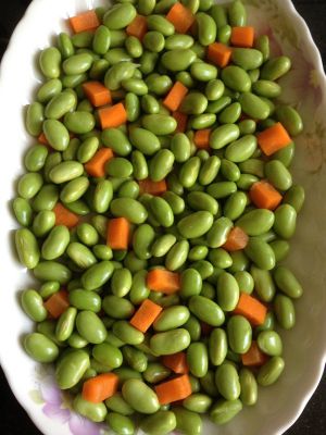 1/3胡萝卜切小丁和毛豆肉混合,加入2小勺盐抓匀,放入盆中摊平,腌制备用;