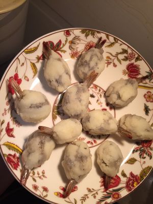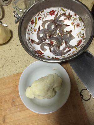 虾去皮 去头 去线 土豆蒸熟捣成泥 放点盐搅拌