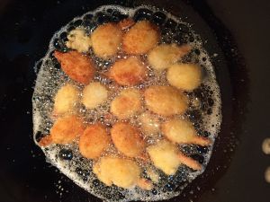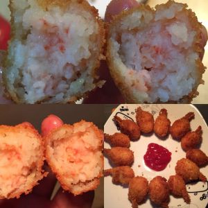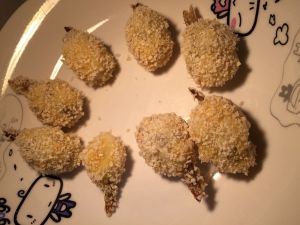 虾剁碎后放盐 生粉 料酒 蛋白液一点。搅拌好,然后土豆泥裹起来。