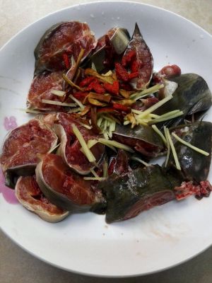将魚切成薄片,加入姜丝、红枣丝、枸杞子。