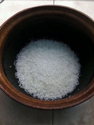 用瓦罐装取农家粘米250g,清洗后加少许花生油及食盐腌3分钟,然后再落适量滚水,放到炉上煲。