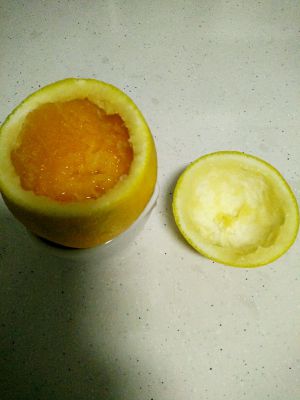 做好的橙盅,要多留些橙肉不挖,这样蒸出来不苦,橙子最好选皮很薄,肉很甜的那种,我这种皮厚蒸出来就微有点苦,不过有止咳功效