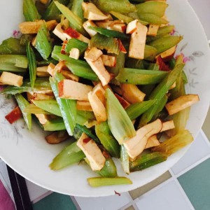 翻炒片刻,放入香干,一起翻炒,放些盐,鸡精等调味料,